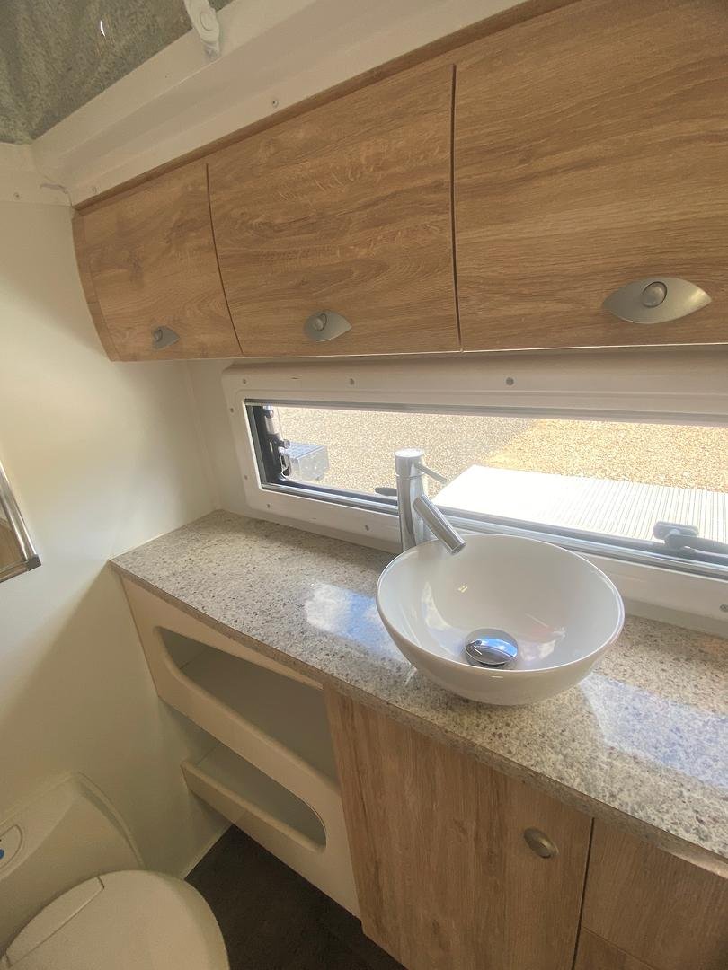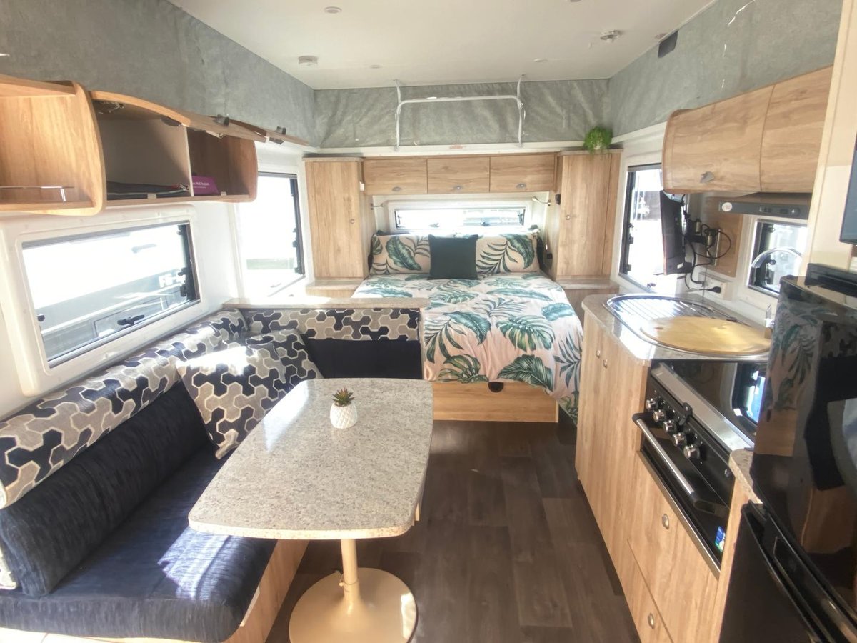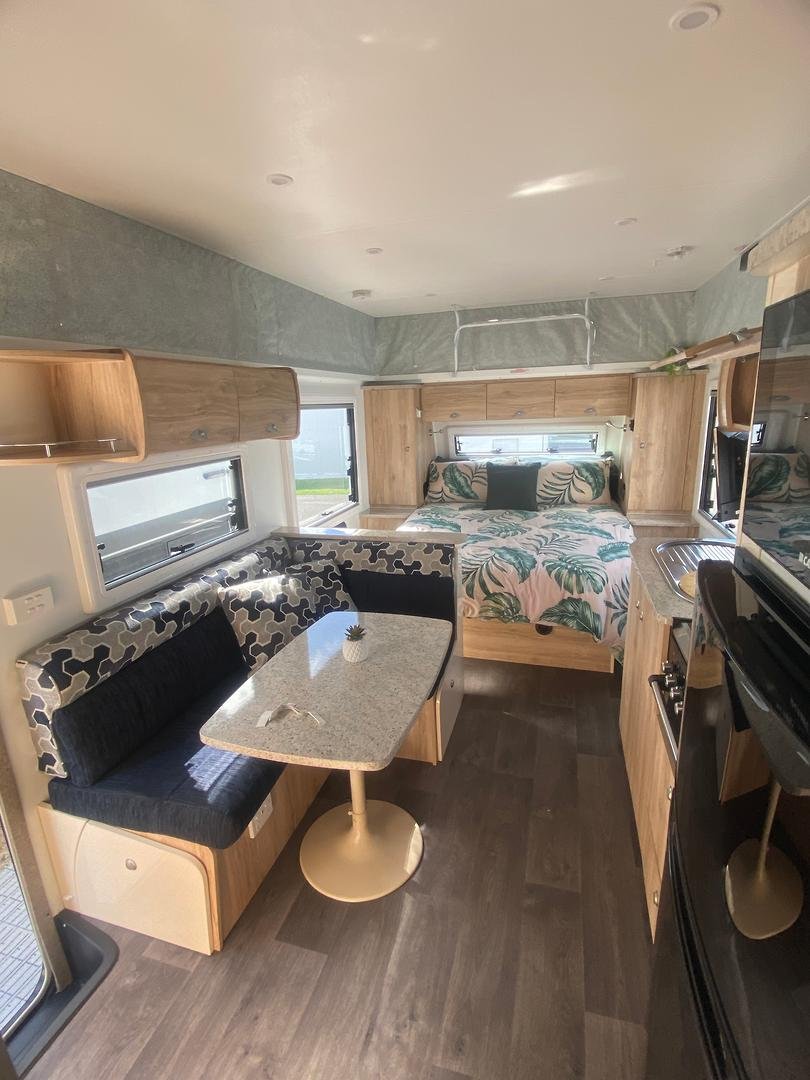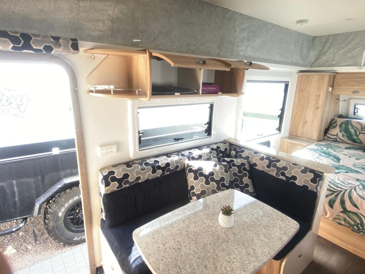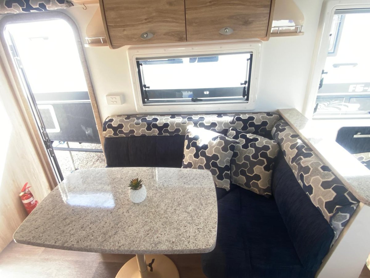 Inside you’ll find a comfortable island bed with storage underneath, plenty of wardrobe space, and a relaxing L-shaped dinette that’s perfect for meals or unwinding after a day on the road, a full ensuite with separate shower, toilet, and vanity, giving you all the comforts of home while travelling.
